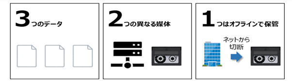 バックアップには、3つのデータを複数の媒体で保管し、うち1つはオフラインで管理する「3-2-1ルール」という考えがあります。