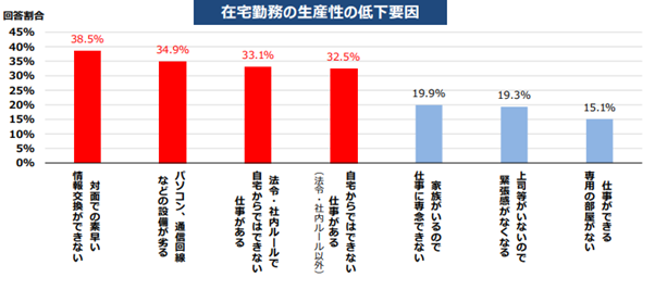 経済産業省の「コロナ禍の経済への影響に関する基礎データ」によると、テレワークで生産性が低くなる主な要因としては以下が挙げられます。